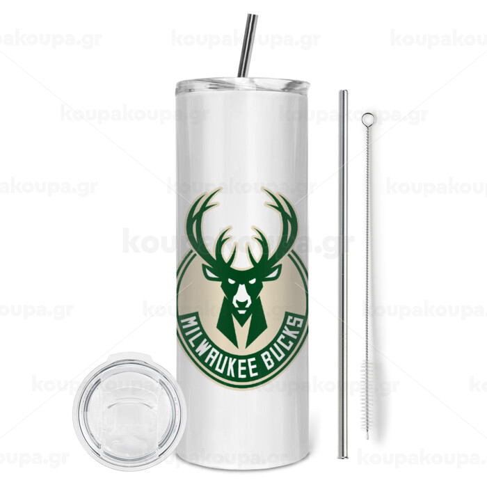 Milwaukee bucks, Tumbler ποτήρι θερμό από ανοξείδωτο ατσάλι 600ml, με μεταλλικό καλαμάκι & βούρτσα καθαρισμού