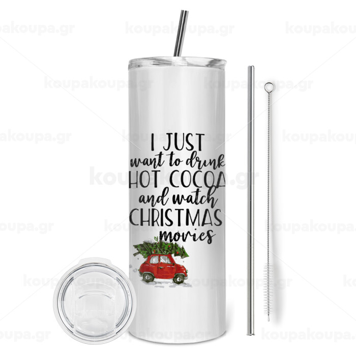 I just want to drink hot cocoa and watch christmas movies mini cooper, Tumbler ποτήρι θερμό από ανοξείδωτο ατσάλι 600ml, με μεταλλικό καλαμάκι & βούρτσα καθαρισμού