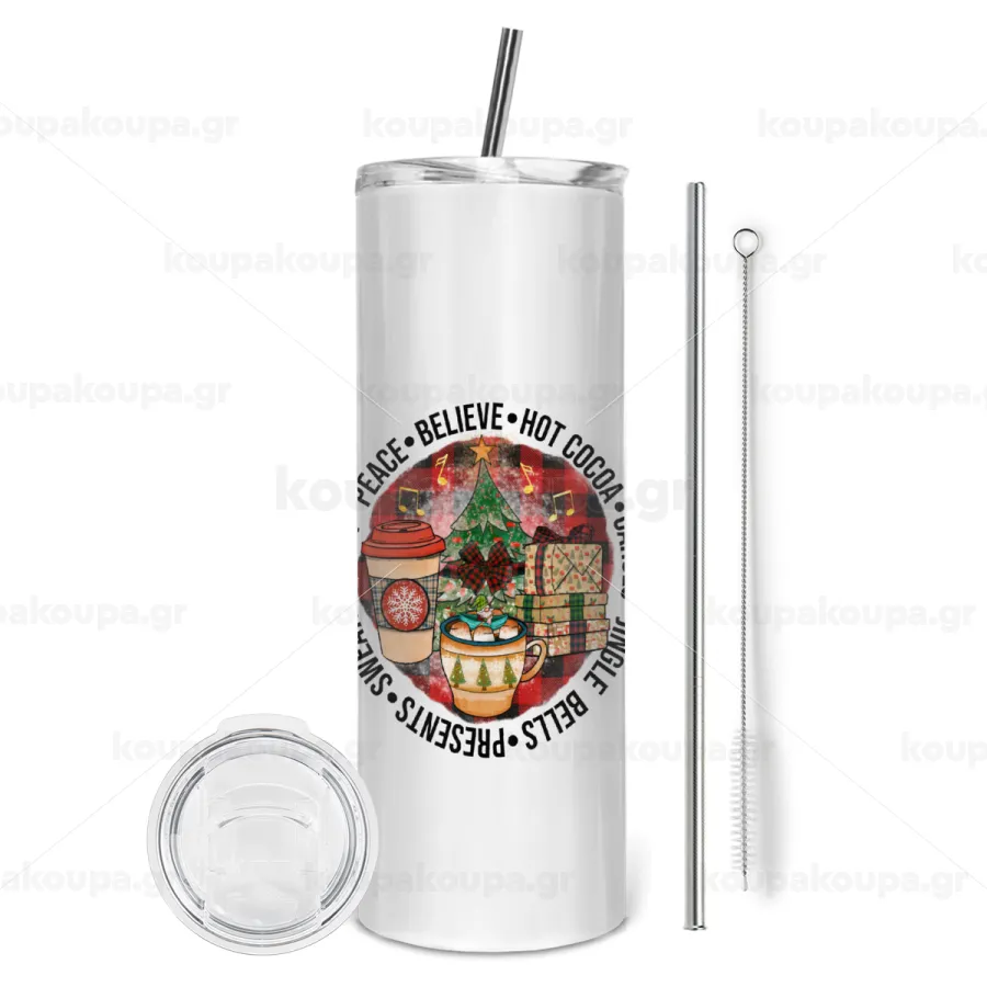 Joy, Peace, Believe, Hot Cocoa, Carols, Tumbler ποτήρι θερμό από ανοξείδωτο ατσάλι 600ml, με μεταλλικό καλαμάκι & βούρτσα καθαρισμού