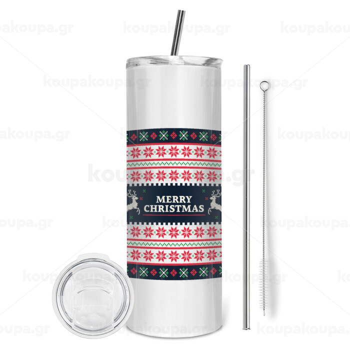 Merry Christmas Vintage, Tumbler ποτήρι θερμό από ανοξείδωτο ατσάλι 600ml, με μεταλλικό καλαμάκι & βούρτσα καθαρισμού