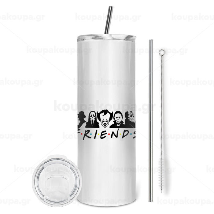 Halloween Friends, Tumbler ποτήρι θερμό από ανοξείδωτο ατσάλι 600ml, με μεταλλικό καλαμάκι & βούρτσα καθαρισμού