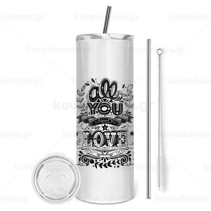 All you need is love, Tumbler ποτήρι θερμό από ανοξείδωτο ατσάλι 600ml, με μεταλλικό καλαμάκι & βούρτσα καθαρισμού