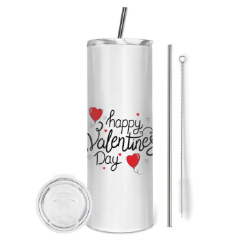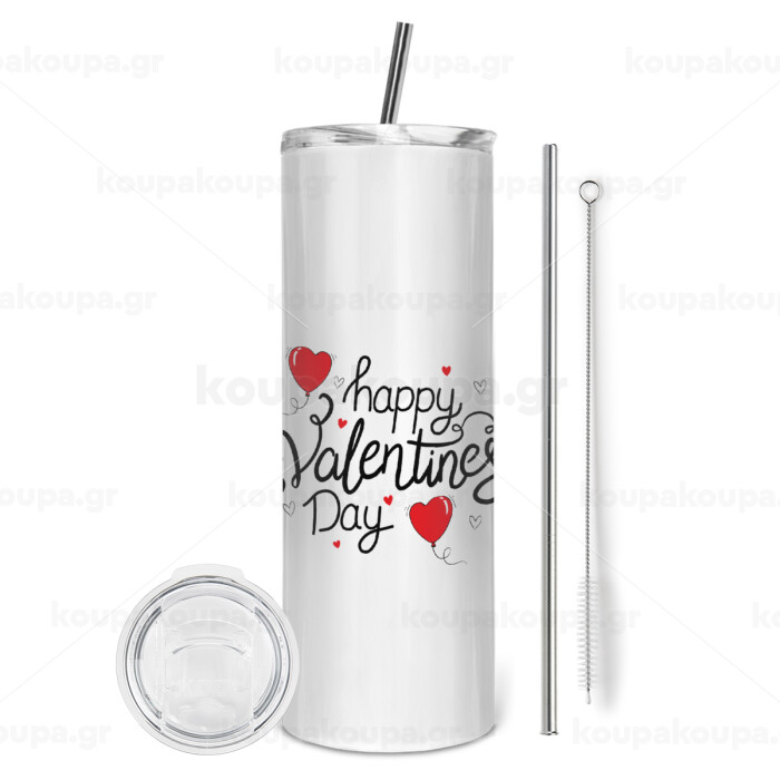 Happy Valentines Day!!!, Tumbler ποτήρι θερμό από ανοξείδωτο ατσάλι 600ml, με μεταλλικό καλαμάκι & βούρτσα καθαρισμού