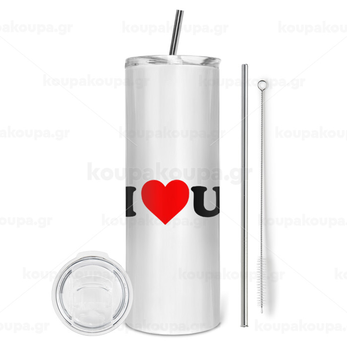 I ❤️ U, Tumbler ποτήρι θερμό από ανοξείδωτο ατσάλι 600ml, με μεταλλικό καλαμάκι & βούρτσα καθαρισμού