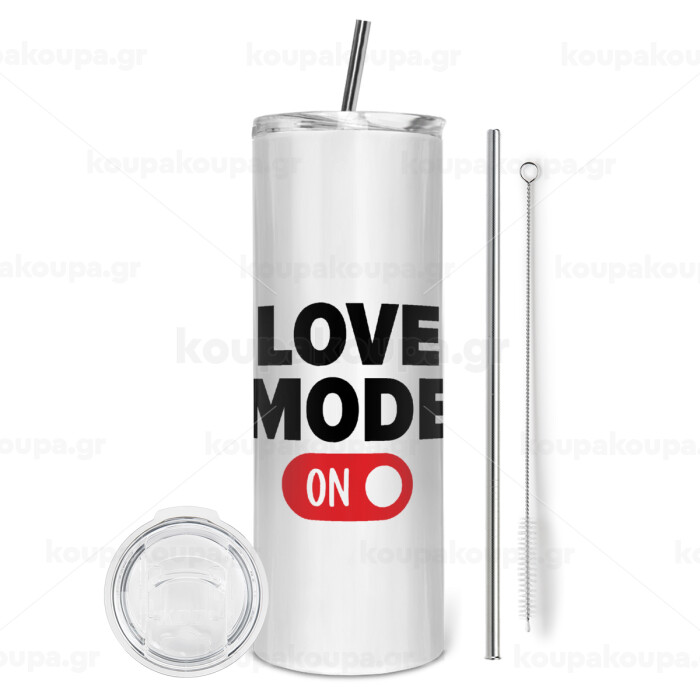 LOVE MODE ON, Tumbler ποτήρι θερμό από ανοξείδωτο ατσάλι 600ml, με μεταλλικό καλαμάκι & βούρτσα καθαρισμού