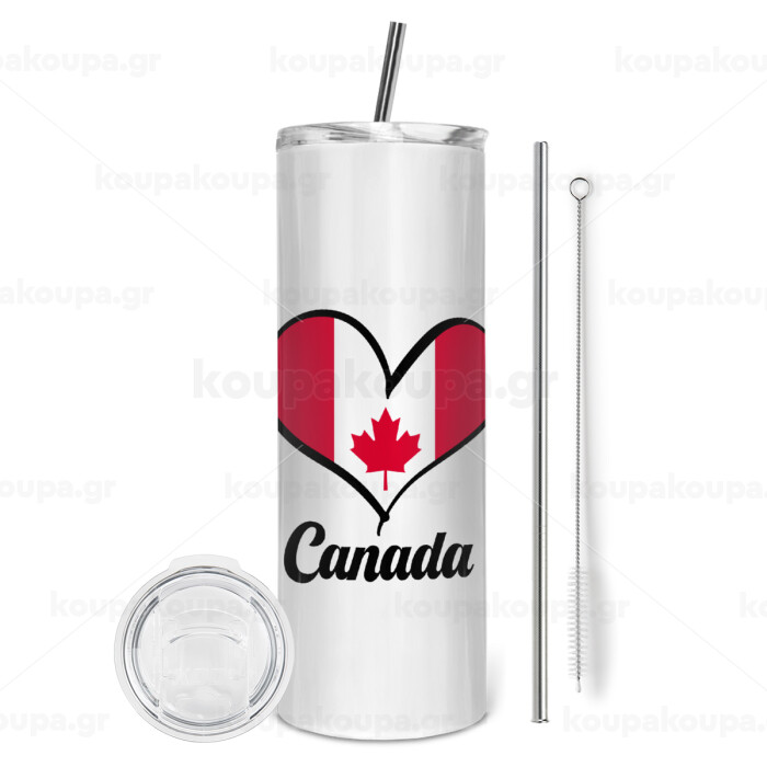 Canada flag, Tumbler ποτήρι θερμό από ανοξείδωτο ατσάλι 600ml, με μεταλλικό καλαμάκι & βούρτσα καθαρισμού