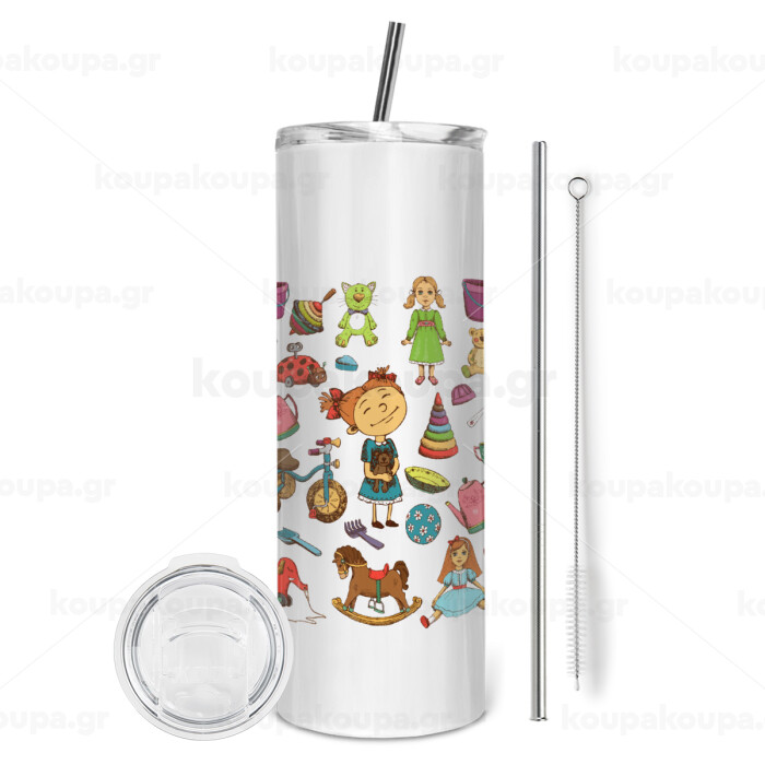 Toys Girl, Tumbler ποτήρι θερμό από ανοξείδωτο ατσάλι 600ml, με μεταλλικό καλαμάκι & βούρτσα καθαρισμού
