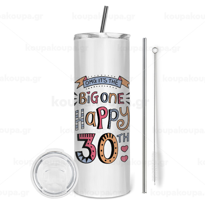 Big one Happy 30th, Tumbler ποτήρι θερμό από ανοξείδωτο ατσάλι 600ml, με μεταλλικό καλαμάκι & βούρτσα καθαρισμού