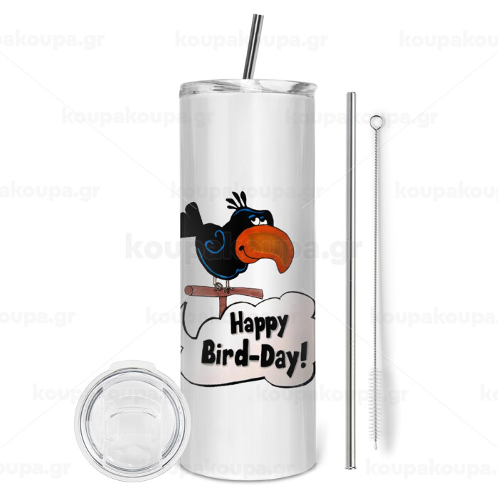 Happy Bird Day, Tumbler ποτήρι θερμό από ανοξείδωτο ατσάλι 600ml, με μεταλλικό καλαμάκι & βούρτσα καθαρισμού