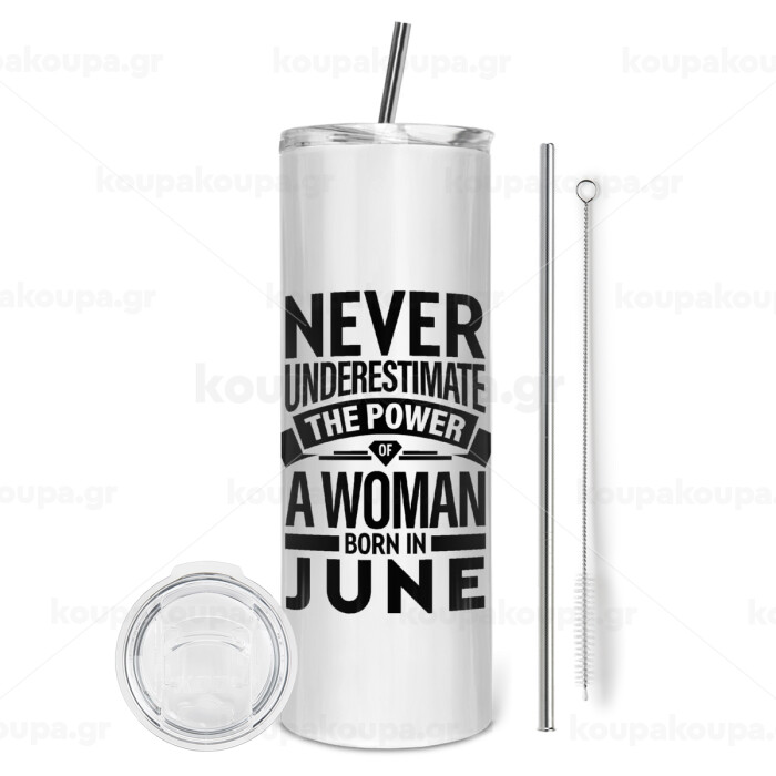 Never Underestimate the poer of a Woman born in..., Tumbler ποτήρι θερμό από ανοξείδωτο ατσάλι 600ml, με μεταλλικό καλαμάκι & βούρτσα καθαρισμού