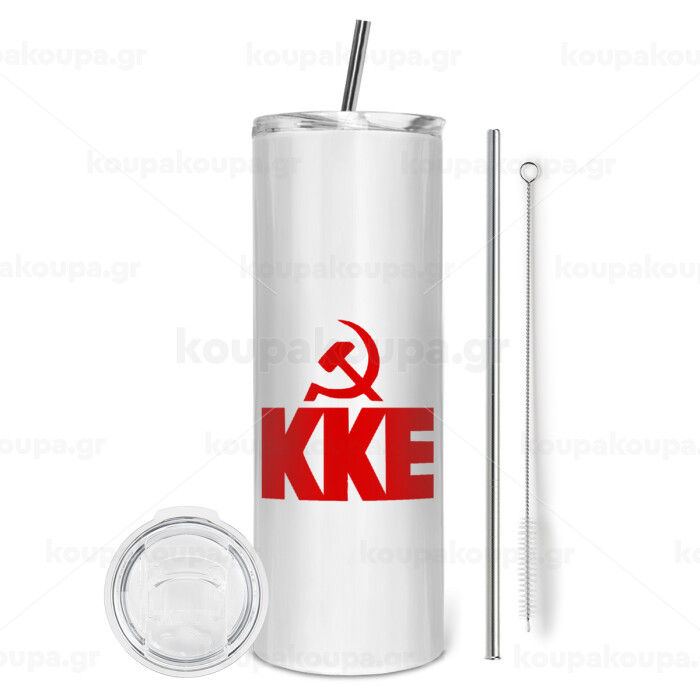 ΚΚΕ, Tumbler ποτήρι θερμό από ανοξείδωτο ατσάλι 600ml, με μεταλλικό καλαμάκι & βούρτσα καθαρισμού