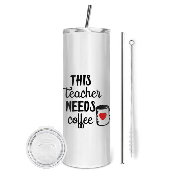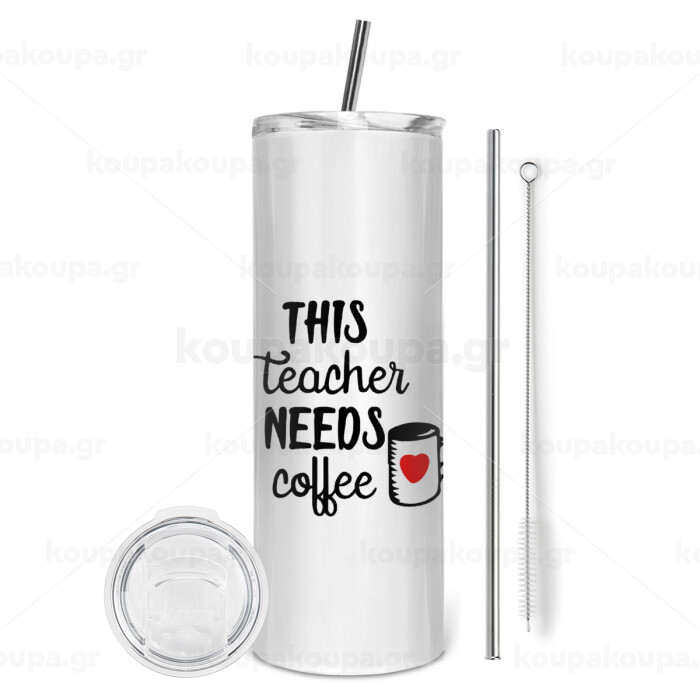 Τhis teacher needs coffee, Tumbler ποτήρι θερμό από ανοξείδωτο ατσάλι 600ml, με μεταλλικό καλαμάκι & βούρτσα καθαρισμού