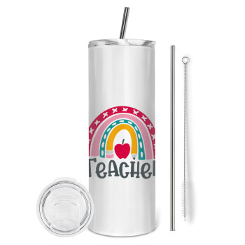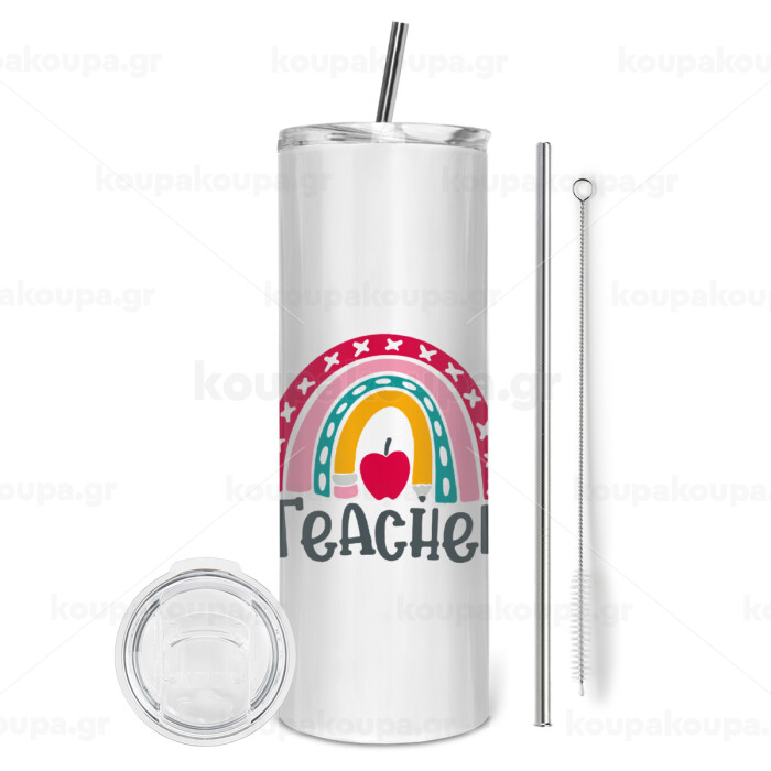 Rainbow teacher, Tumbler ποτήρι θερμό από ανοξείδωτο ατσάλι 600ml, με μεταλλικό καλαμάκι & βούρτσα καθαρισμού