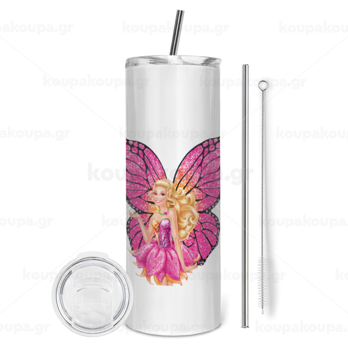 Barbie Νεράιδα, Tumbler ποτήρι θερμό από ανοξείδωτο ατσάλι 600ml, με μεταλλικό καλαμάκι & βούρτσα καθαρισμού