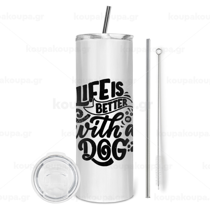 Life is better with a DOG, Tumbler ποτήρι θερμό από ανοξείδωτο ατσάλι 600ml, με μεταλλικό καλαμάκι & βούρτσα καθαρισμού