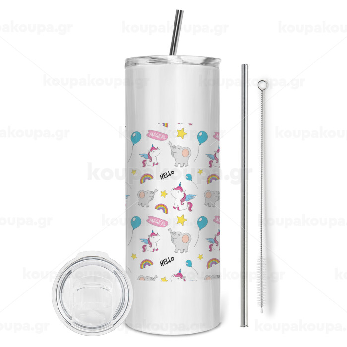 Happy Clouds Doodle, Tumbler ποτήρι θερμό από ανοξείδωτο ατσάλι 600ml, με μεταλλικό καλαμάκι & βούρτσα καθαρισμού