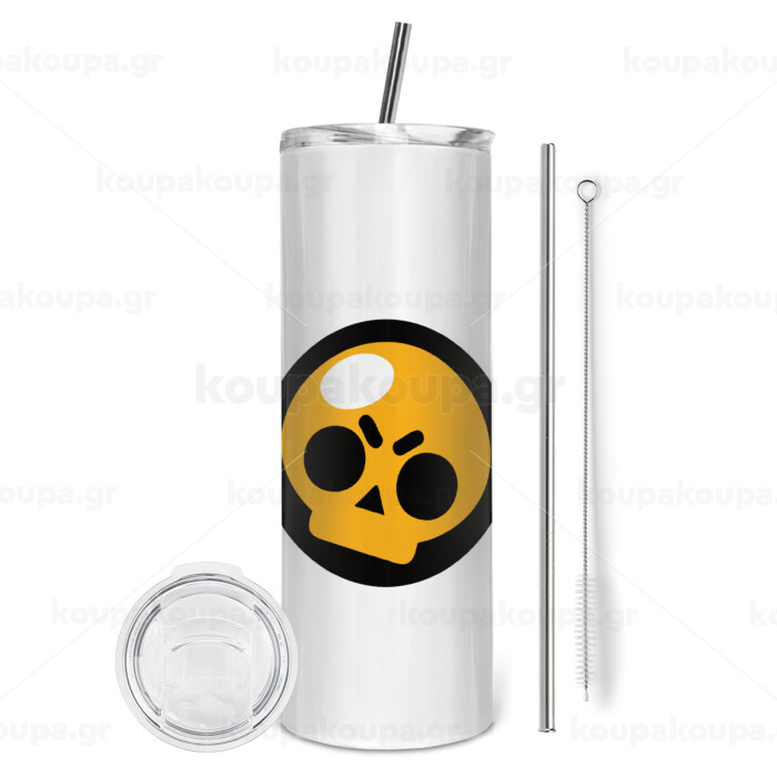 Brawl Stars Skull, Tumbler ποτήρι θερμό από ανοξείδωτο ατσάλι 600ml, με μεταλλικό καλαμάκι & βούρτσα καθαρισμού