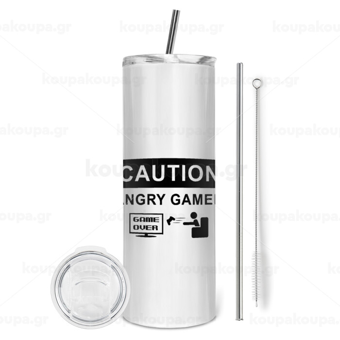 Caution, angry gamer!, Tumbler ποτήρι θερμό από ανοξείδωτο ατσάλι 600ml, με μεταλλικό καλαμάκι & βούρτσα καθαρισμού