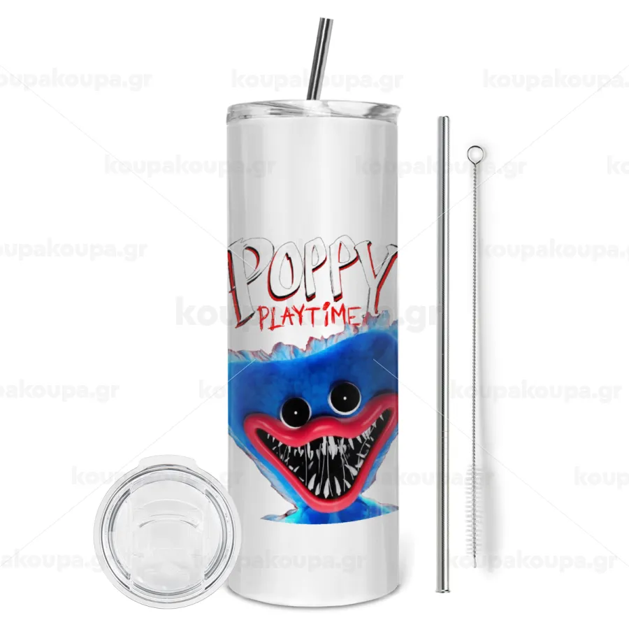 Poppy Playtime Huggy wuggy, Tumbler ποτήρι θερμό από ανοξείδωτο ατσάλι 600ml, με μεταλλικό καλαμάκι & βούρτσα καθαρισμού