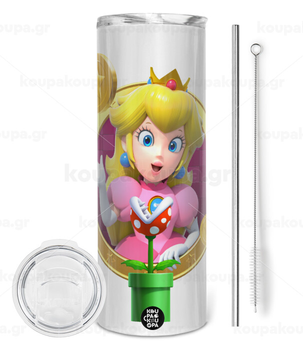 Princess Peach Toadstool, Tumbler ποτήρι θερμό από ανοξείδωτο ατσάλι 600ml, με μεταλλικό καλαμάκι & βούρτσα καθαρισμού
