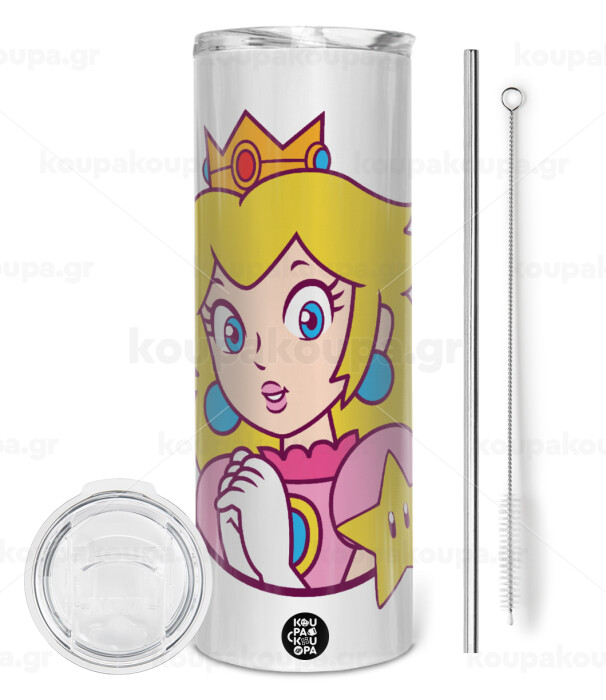 Princess Peach, Tumbler ποτήρι θερμό από ανοξείδωτο ατσάλι 600ml, με μεταλλικό καλαμάκι & βούρτσα καθαρισμού
