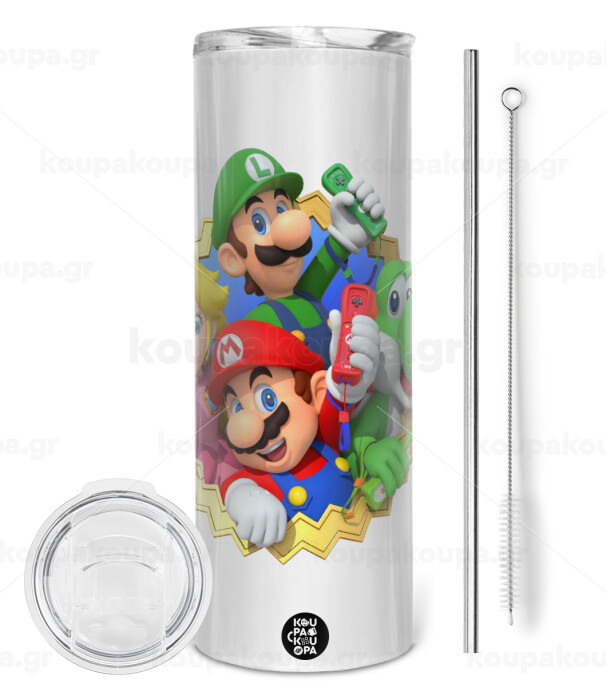 Super mario and Friends, Tumbler ποτήρι θερμό από ανοξείδωτο ατσάλι 600ml, με μεταλλικό καλαμάκι & βούρτσα καθαρισμού