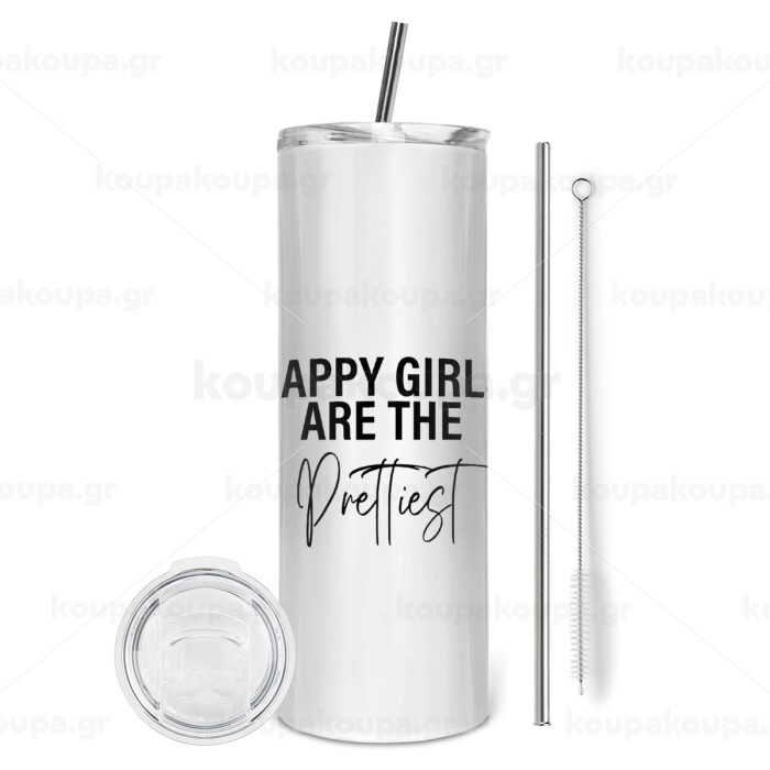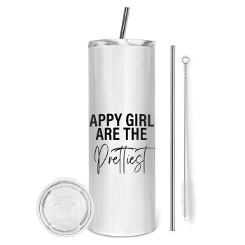 Happy girls are the prettiest, Tumbler ποτήρι θερμό από ανοξείδωτο ατσάλι 600ml, με μεταλλικό καλαμάκι & βούρτσα καθαρισμού