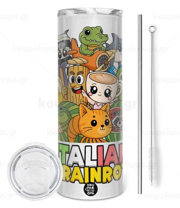 Italian Brainrot friends, Tumbler ποτήρι θερμό από ανοξείδωτο ατσάλι 600ml, με μεταλλικό καλαμάκι & βούρτσα καθαρισμού