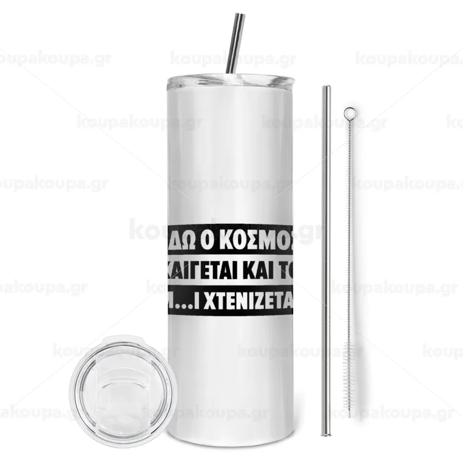 Εδώ ο κόσμος καίγεται και το Μ....Ι χτενίζεται, Tumbler ποτήρι θερμό από ανοξείδωτο ατσάλι 600ml, με μεταλλικό καλαμάκι & βούρτσα καθαρισμού