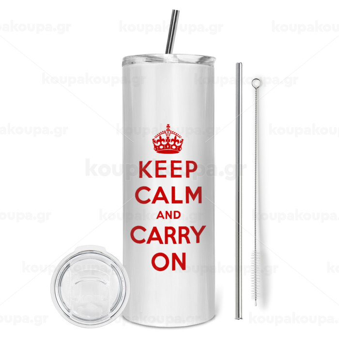 KEEP CALM  and carry on, Tumbler ποτήρι θερμό από ανοξείδωτο ατσάλι 600ml, με μεταλλικό καλαμάκι & βούρτσα καθαρισμού
