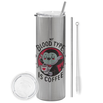 My blood type is coffee, Tumbler ποτήρι θερμό Ασημένιο από ανοξείδωτο ατσάλι 600ml, με μεταλλικό καλαμάκι & βούρτσα καθαρισμού