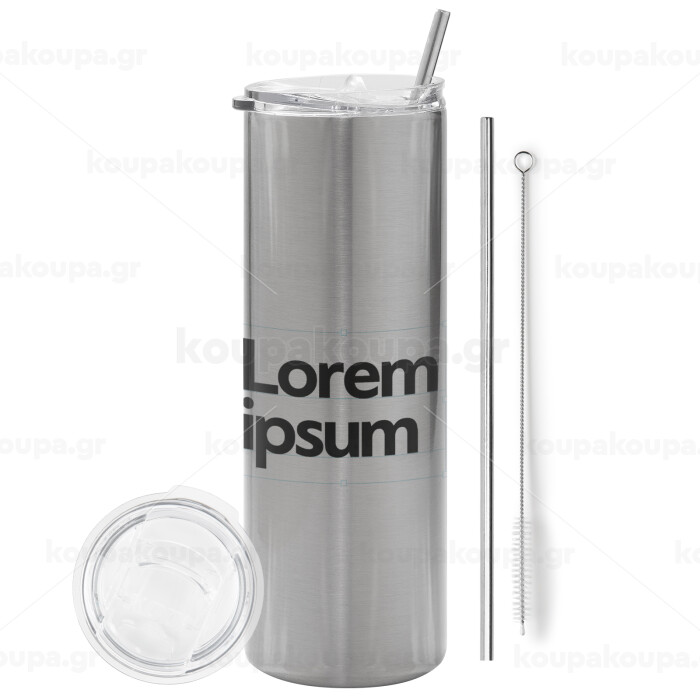 Lorem ipsum, Tumbler ποτήρι θερμό Ασημένιο από ανοξείδωτο ατσάλι 600ml, με μεταλλικό καλαμάκι & βούρτσα καθαρισμού