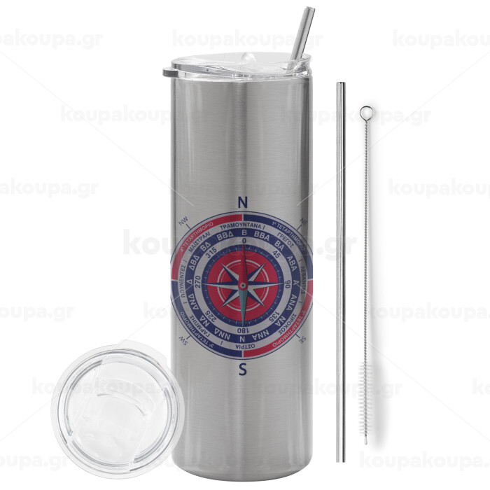 Ανεμολόγιο χάρτης πυξίδα ναυτικού, Tumbler ποτήρι θερμό Ασημένιο από ανοξείδωτο ατσάλι 600ml, με μεταλλικό καλαμάκι & βούρτσα καθαρισμού