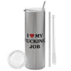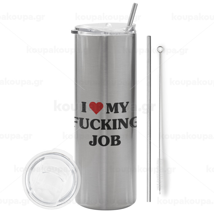 I love my fucking job, Tumbler ποτήρι θερμό Ασημένιο από ανοξείδωτο ατσάλι 600ml, με μεταλλικό καλαμάκι & βούρτσα καθαρισμού