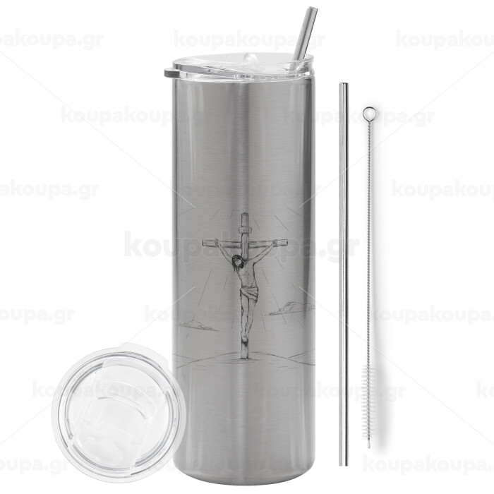Jesus Christ , Tumbler ποτήρι θερμό Ασημένιο από ανοξείδωτο ατσάλι 600ml, με μεταλλικό καλαμάκι & βούρτσα καθαρισμού