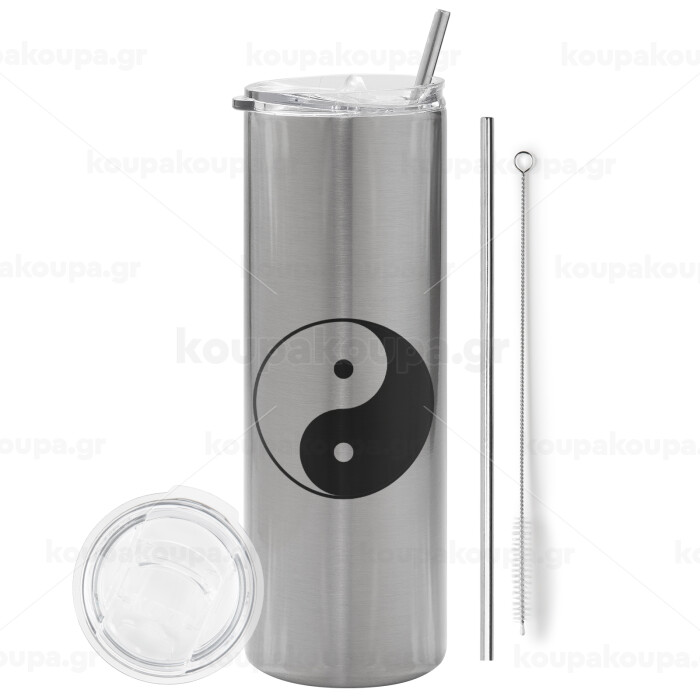Yin Yang, Tumbler ποτήρι θερμό Ασημένιο από ανοξείδωτο ατσάλι 600ml, με μεταλλικό καλαμάκι & βούρτσα καθαρισμού