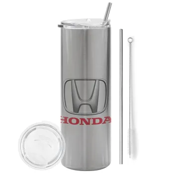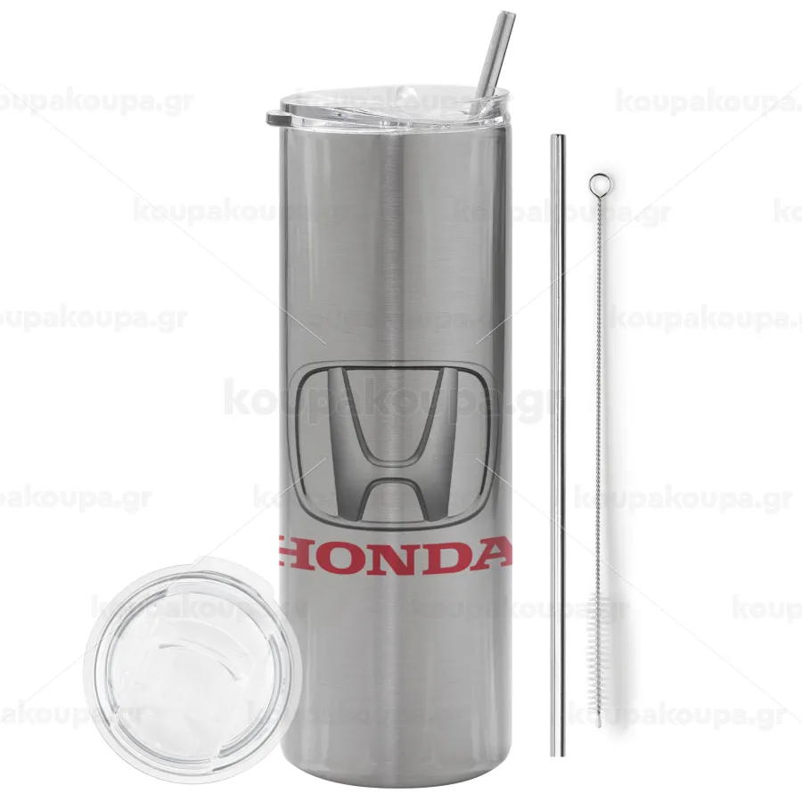 HONDA, Tumbler ποτήρι θερμό Ασημένιο από ανοξείδωτο ατσάλι 600ml, με μεταλλικό καλαμάκι & βούρτσα καθαρισμού
