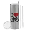 I love Bike, Tumbler ποτήρι θερμό Ασημένιο από ανοξείδωτο ατσάλι 600ml, με μεταλλικό καλαμάκι & βούρτσα καθαρισμού