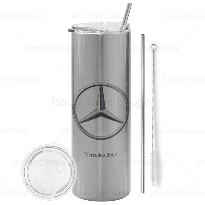 mercedes, Tumbler ποτήρι θερμό Ασημένιο από ανοξείδωτο ατσάλι 600ml, με μεταλλικό καλαμάκι & βούρτσα καθαρισμού