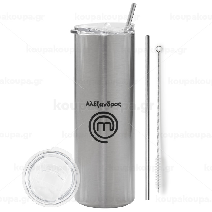 Master Chef Greece, Tumbler ποτήρι θερμό Ασημένιο από ανοξείδωτο ατσάλι 600ml, με μεταλλικό καλαμάκι & βούρτσα καθαρισμού