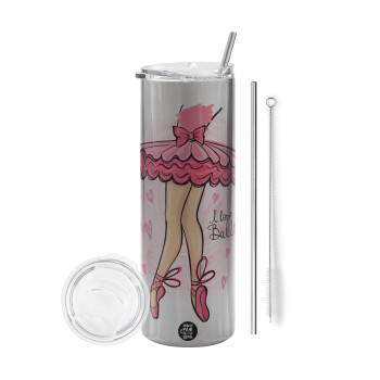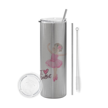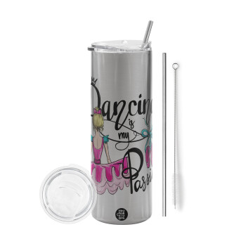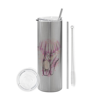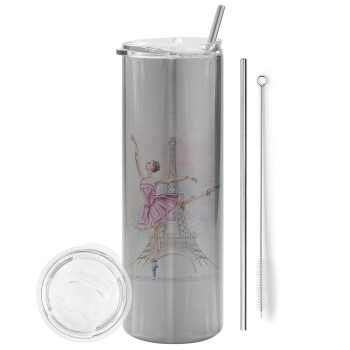 Ballerina in Paris, Tumbler ποτήρι θερμό Ασημένιο από ανοξείδωτο ατσάλι 600ml, με μεταλλικό καλαμάκι & βούρτσα καθαρισμού