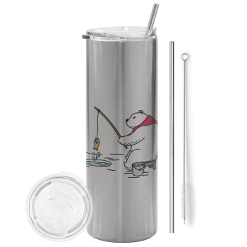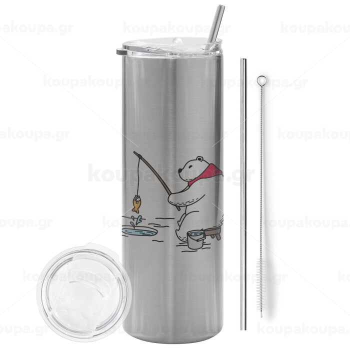 Αρκούδα ψαρεύει, Tumbler ποτήρι θερμό Ασημένιο από ανοξείδωτο ατσάλι 600ml, με μεταλλικό καλαμάκι & βούρτσα καθαρισμού