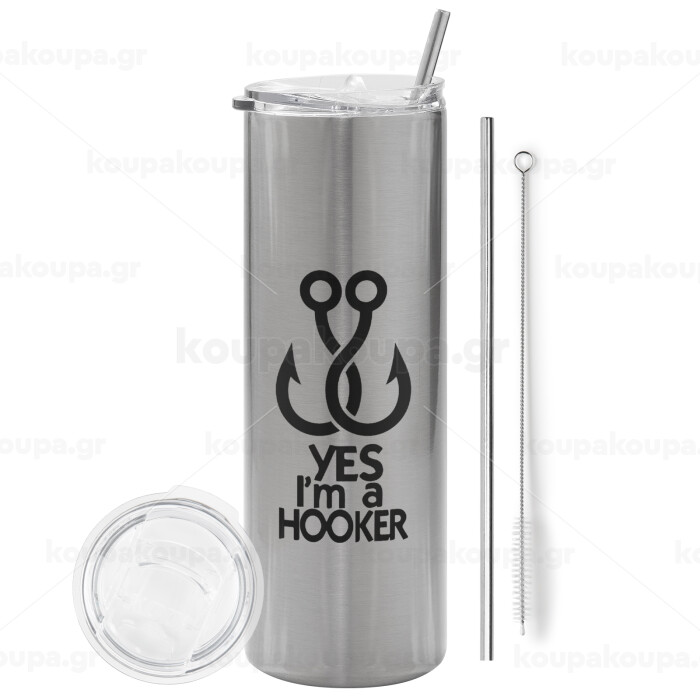 Yes i am Hooker, Tumbler ποτήρι θερμό Ασημένιο από ανοξείδωτο ατσάλι 600ml, με μεταλλικό καλαμάκι & βούρτσα καθαρισμού