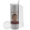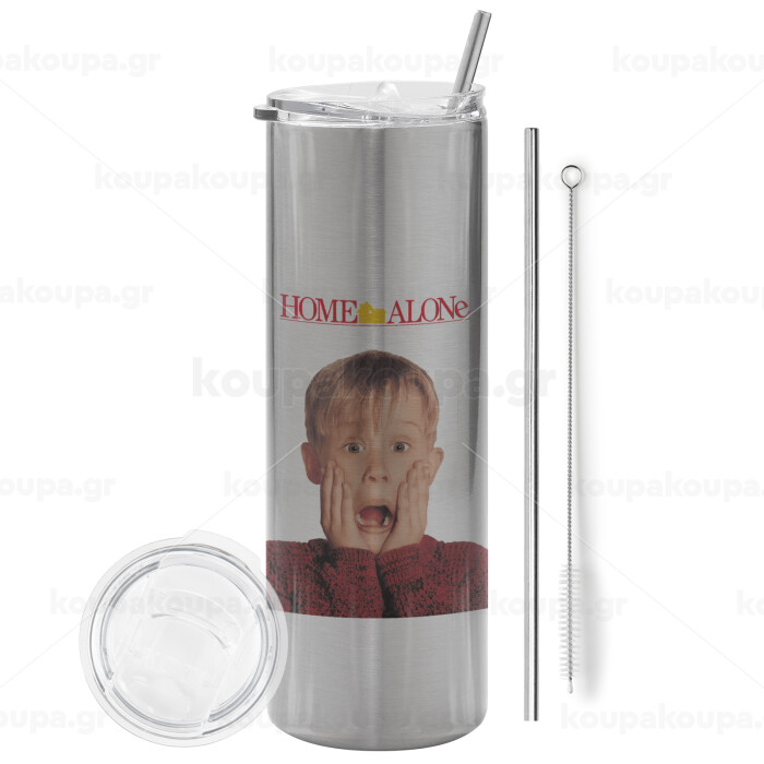 Μόνος στο σπίτι Kevin McCallister Shocked, Tumbler ποτήρι θερμό Ασημένιο από ανοξείδωτο ατσάλι 600ml, με μεταλλικό καλαμάκι & βούρτσα καθαρισμού