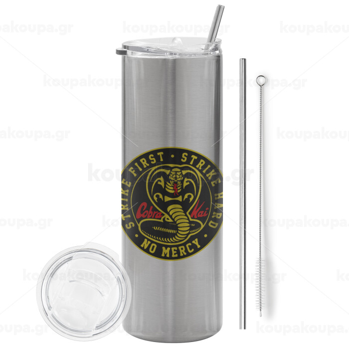 cobra kai strike first dojo, Tumbler ποτήρι θερμό Ασημένιο από ανοξείδωτο ατσάλι 600ml, με μεταλλικό καλαμάκι & βούρτσα καθαρισμού