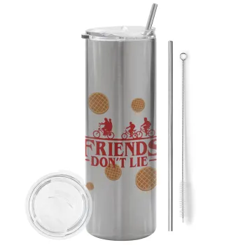 Friends Don't Lie, Stranger Things, Tumbler ποτήρι θερμό Ασημένιο από ανοξείδωτο ατσάλι 600ml, με μεταλλικό καλαμάκι & βούρτσα καθαρισμού