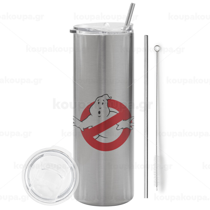 The Ghostbusters, Tumbler ποτήρι θερμό Ασημένιο από ανοξείδωτο ατσάλι 600ml, με μεταλλικό καλαμάκι & βούρτσα καθαρισμού