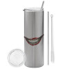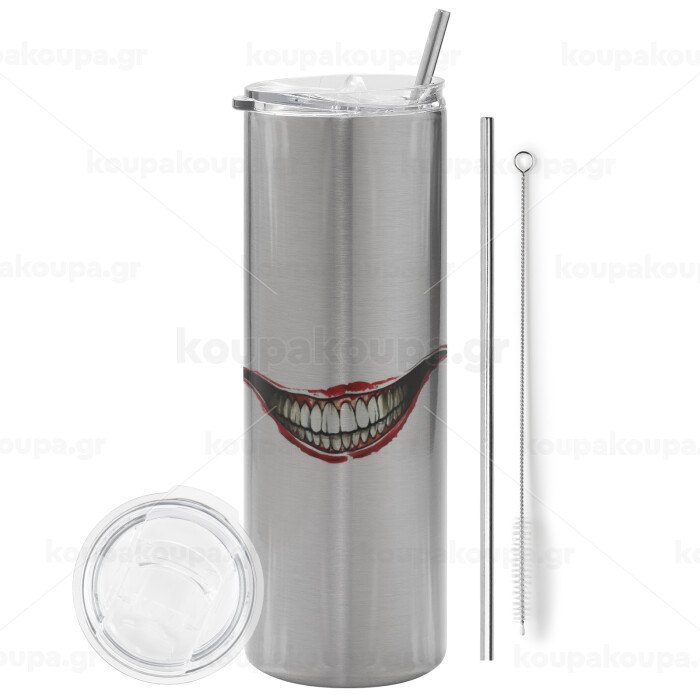 Joker smile, Tumbler ποτήρι θερμό Ασημένιο από ανοξείδωτο ατσάλι 600ml, με μεταλλικό καλαμάκι & βούρτσα καθαρισμού