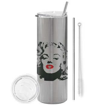Merilin, Tumbler ποτήρι θερμό Ασημένιο από ανοξείδωτο ατσάλι 600ml, με μεταλλικό καλαμάκι & βούρτσα καθαρισμού