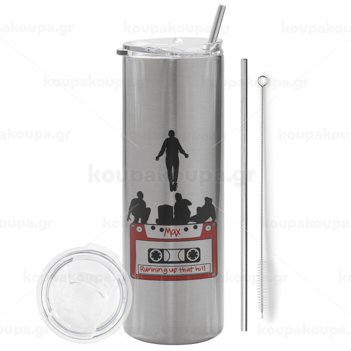 Running up that hill, Stranger Things, Tumbler ποτήρι θερμό Ασημένιο από ανοξείδωτο ατσάλι 600ml, με μεταλλικό καλαμάκι & βούρτσα καθαρισμού